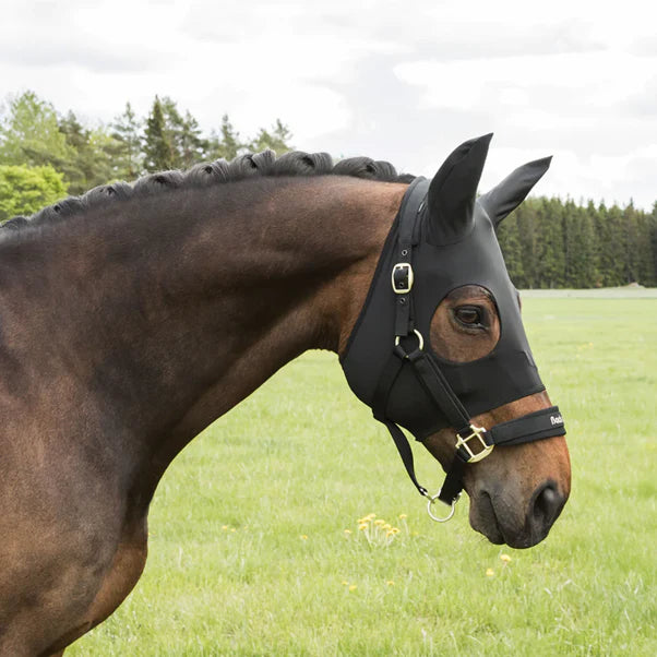 The hood is highly elastic, thin and supple with a smooth surface. It encloses the ears and extends over the horse's face like a mask. The seams are elastic for maximum flexibility, and positioned so that pressure on nerves and muscle attachments can be minimized.
