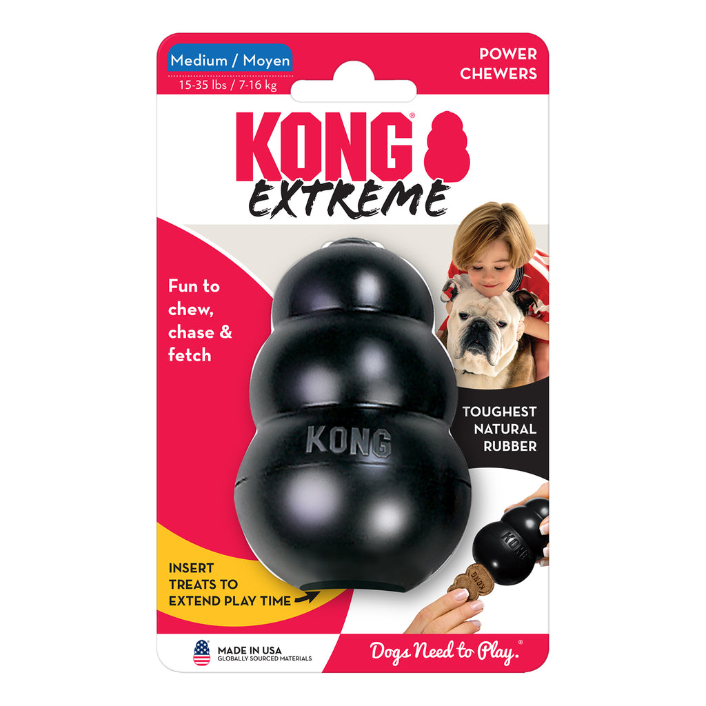The KONG Extreme dog toy represents the most durable strength of KONG rubber. Designed for the toughest of chewers, the KONG Extreme offers enrichment and helps satisfy dogs’ instinctual needs. The unique, ultra-durable, natural rubber formula is crafted for determined chewers, while the erratic bounce fulfills a dog’s need to play.