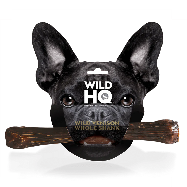 One whole, air-dried, wild venison leg shank wrapped in wild venison oesophagus. Dogs love this long lasting treat. That’s it!