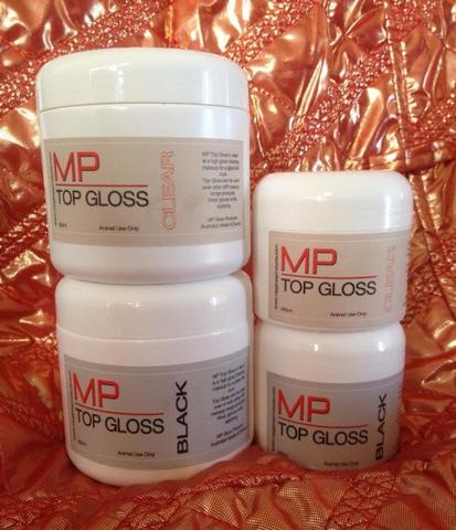 MP 'TOP' Gloss CLEAR and MP 'TOP" Gloss BLACK are the ultimate glosses for your horses face makeup. Contain natural oils and waxes. Used on the face to 'highlight' this gloss will create a look that shines like glass.. Can be used with or without the other MP Gloss Products underneath.