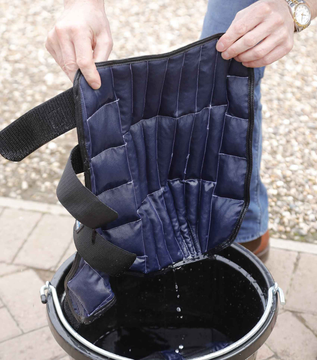 After hard work the Cold Water Boots should be applied for around 20 minutes. For extra cold treatment place ice or ice packs in the bucket of water that they are being soaked in. The colder the water, the colder the boots. For a maximum cold effect, place the Cold Water Boots straight from the ice water into a bag and leave in the fridge for one hour, this will provide a 3-5 minute initial blast of cold on the horse's leg. Never freeze Cold Water Boots.