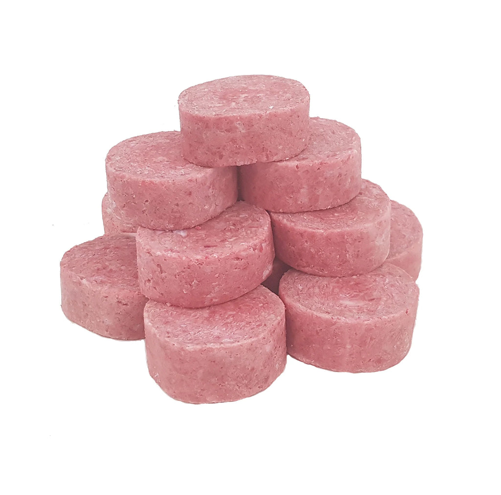 Great for cats and dogs the medallions are in 90g portions and are made from minced chicken frames and contain ground bone.