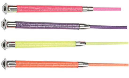 These ultra flexible dressage whips are beautifully balanced, and feature a lightly ridged comfort gel handle. Braided polypropylene shaft in a range of fashion neon colours with silver ferrule and cap.